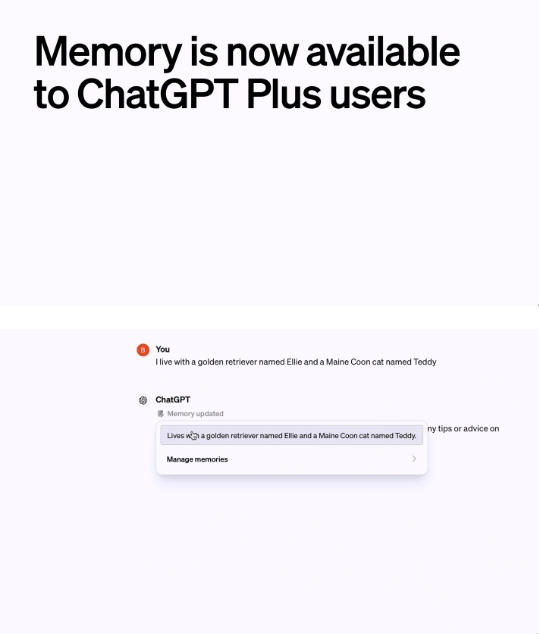 OpenAI 公司今天宣布,面向所有 ChatGPT Plus 用戶開放“記憶”(Memory)功能,可以讓 ChatGPT 記住用戶在聊天中討論過的事情,并避免重復信息。