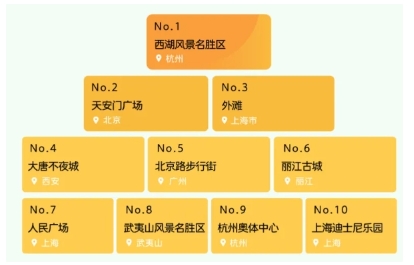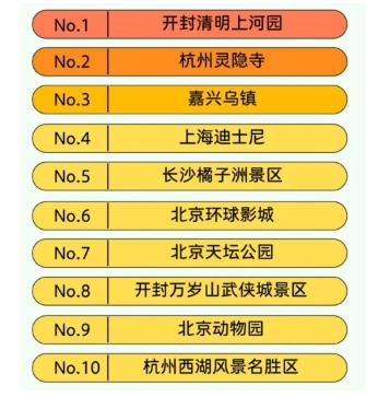 全國熱門景區 TOP10:開封清明上河園、杭州靈隱寺、嘉興烏鎮、上海迪士尼、長沙橘子洲景區、北京環球影城、北京天壇公園、開封萬歲山武俠城景區、北京動物園、杭州西湖風景名勝區。