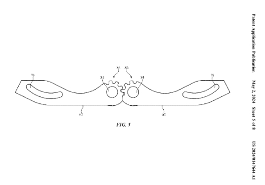 圖 5 中展示了齒輪狀的鉸鏈設計,齒輪板具有容納軸 #82 的開口 #84,以便齒輪板可以繞軸旋轉。外殼 (#12) 的一半繞軸 #28 旋轉時,板的配合齒使外殼的另一半同步旋轉。