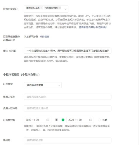 4、服務類型標識一般選1個,對于普通行業的前置審批選項,點開下拉選擇“以上都不涉及”,備注說明小程序類型、功能和作用。