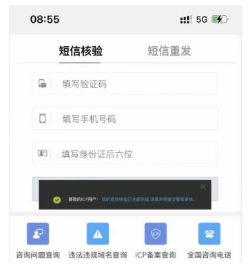 7、騰訊初審通過,法人會收到一個工信部的短信,里面有一個鏈接,點擊鏈接進入頁面頂部勾選“小程序”,填寫手機號、驗證碼和身份證后六位數,提交就可以。