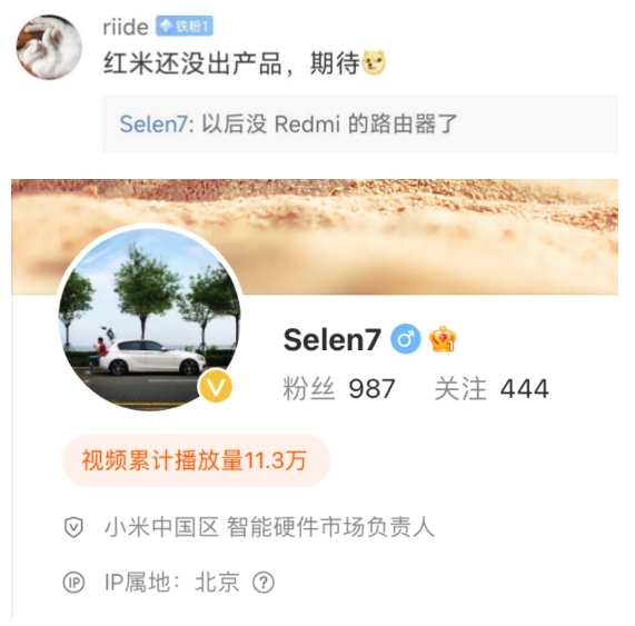 在博主 @Kang 的評論區里,認證為小米中國區智能硬件市場負責人 @Selen7 回復網友評論稱,以后沒 Redmi 品牌的路由器了。