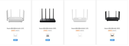 目前小米官網在售的 Redmi 路由器有 5 款,均為 Wi-Fi6 路由器,分別是 Redmi 路由器 AX5400、Redmi 路由器 AX6000、Redmi 路由器 AX3000、Redmi 路由器 AX6S 和 Redmi 電競路由器 AX5400,售價從 239 元到 459 元不等。