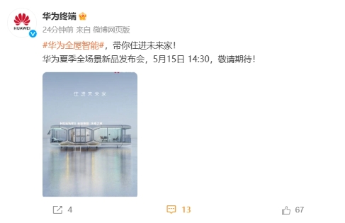 華為官宣,5 月 15 日夏季全場景發布會將帶來全屋智能新品“未來之家”。