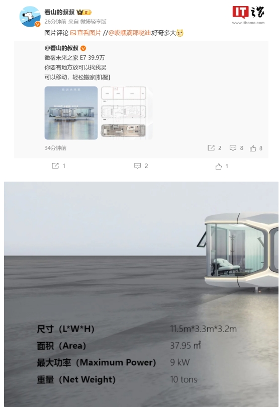 博主 @看山的叔叔 爆料,產品“微宿未來之家 E7”太空艙支持移動,售價在 39.9 萬元,尺寸為 11.5×3.3×3.2m,面積 37.95m²,支持 9kW 最大功率,重量 10 噸。