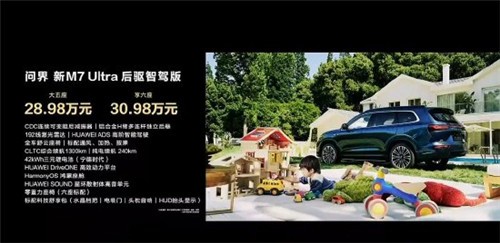 問界新M7 Ultra后驅智駕版,五座版本售價28.98萬元,六座版本售價30.98萬元;四驅智駕版,五座版本售價30.98萬元,六座版本售價32.98萬元。