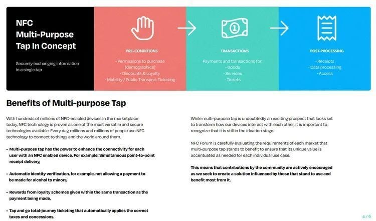 IT之家 7 月 2 日消息,近場(chǎng)通信(NFC)技術(shù)即將引入全新的“Multi-Purpose Tap”功能,讓用戶(hù)使用智能手機(jī)、智能手表 NFC 功能時(shí),可以同時(shí)完成多項(xiàng)功能。