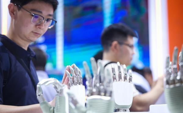 WAIC上,展示了模擬人體手部運動的高靈敏度末端執(zhí)行裝置,由手掌、手腕、五個手指、電機、傳動部件等部分組成。