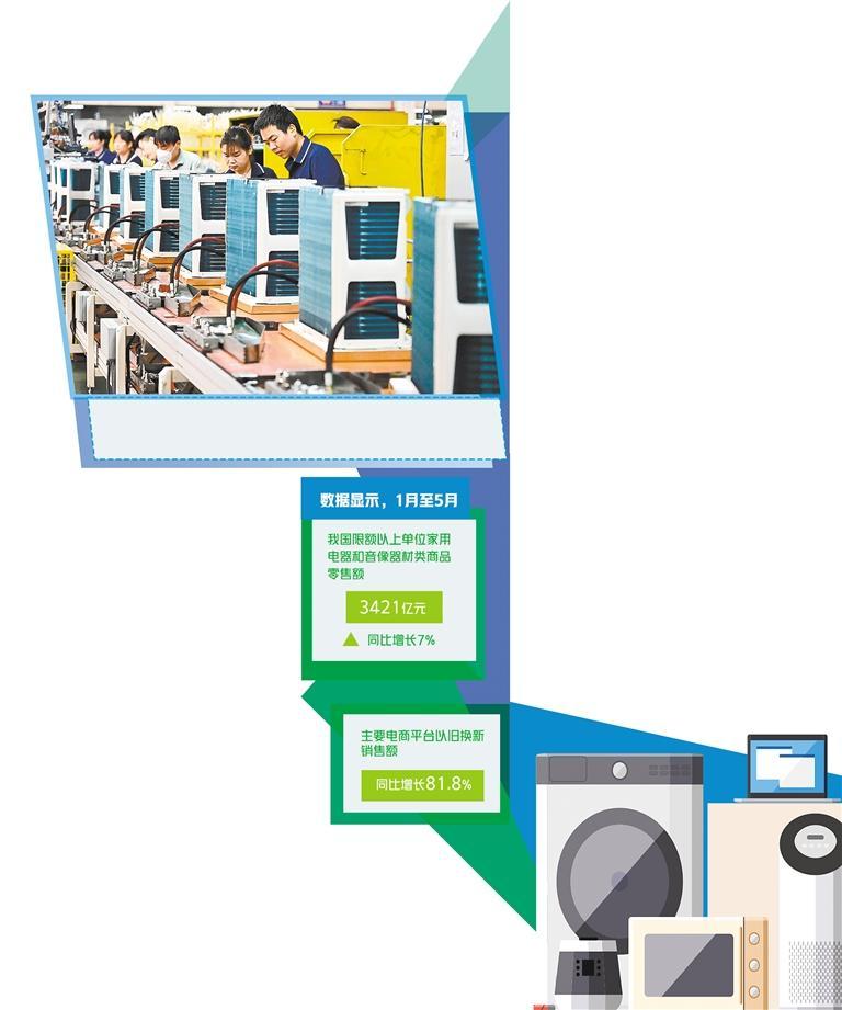 數(shù)據(jù)顯示,1月至5月,我國(guó)限額以上單位家用電器和音像器材類商品零售額3421億元,同比增長(zhǎng)7%;主要電商平臺(tái)以舊換新銷售額同比增長(zhǎng)81.8%。