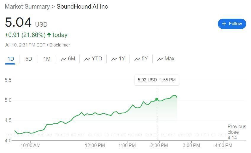 消息傳出后,SoundHound股價加速上行,美股午盤漲幅擴大到20%以上,勢將5月31日以來首次收盤漲破5.0美元。
