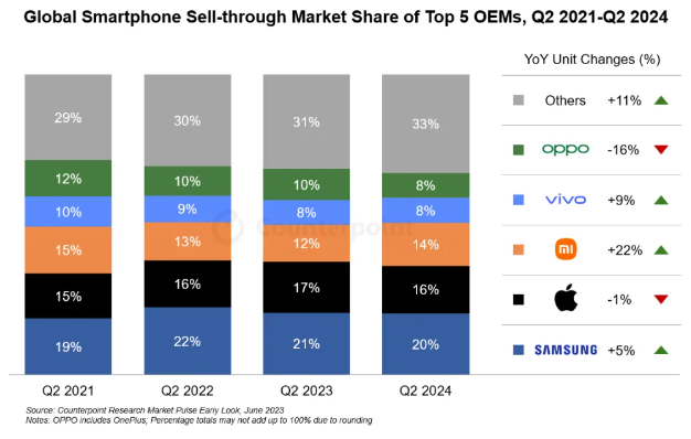 蘋果手機 16% 份額,銷量同比下滑 1%;