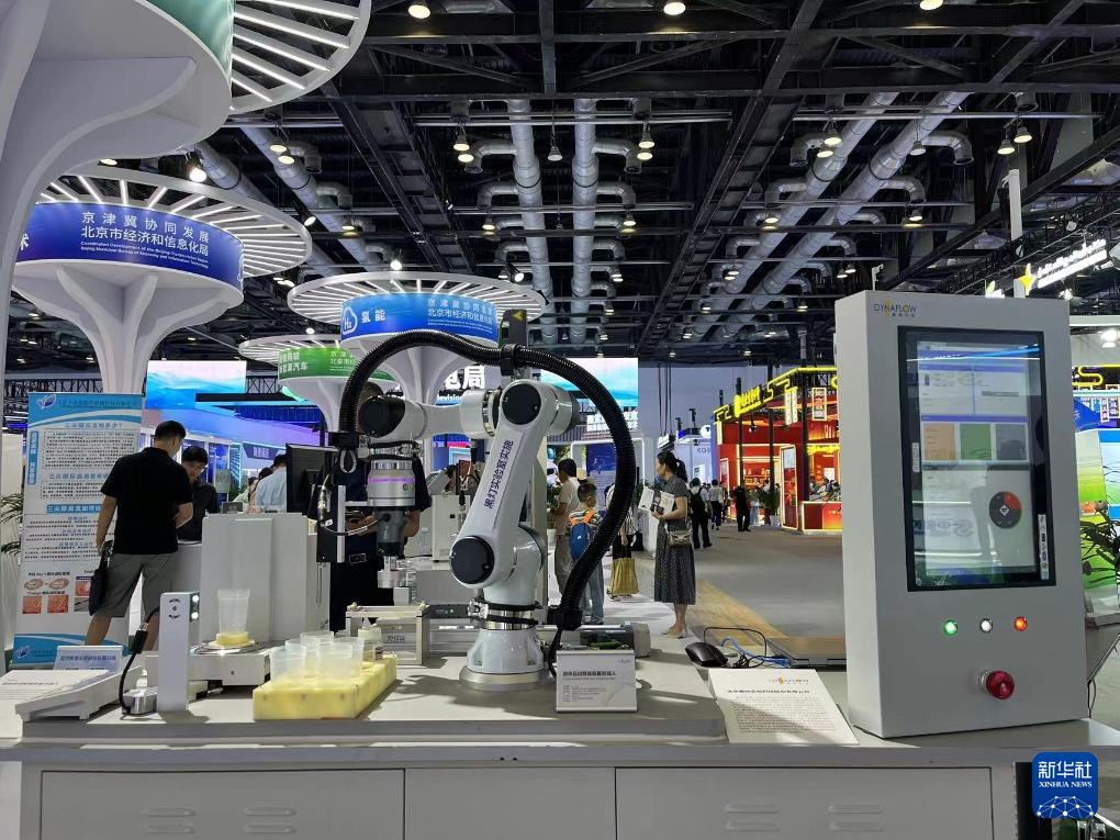 7月15日,在北京科博會上,企業展出的液體自動精準稱重機器人。新華社記者 陽娜 攝