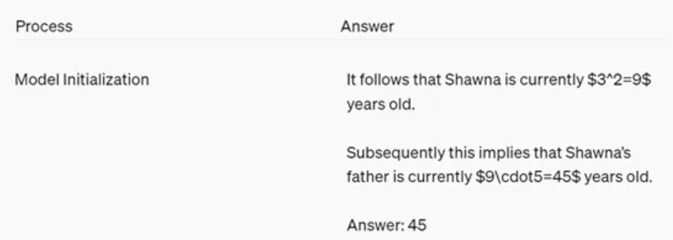 而驗證者模型GPT-3需要確定阿莉亞的年齡,然后根據阿莉亞的年齡計算出肖娜的年齡,最后再根據肖娜的年齡計算出肖娜父親的年齡,整個過程需要多輪驗證。