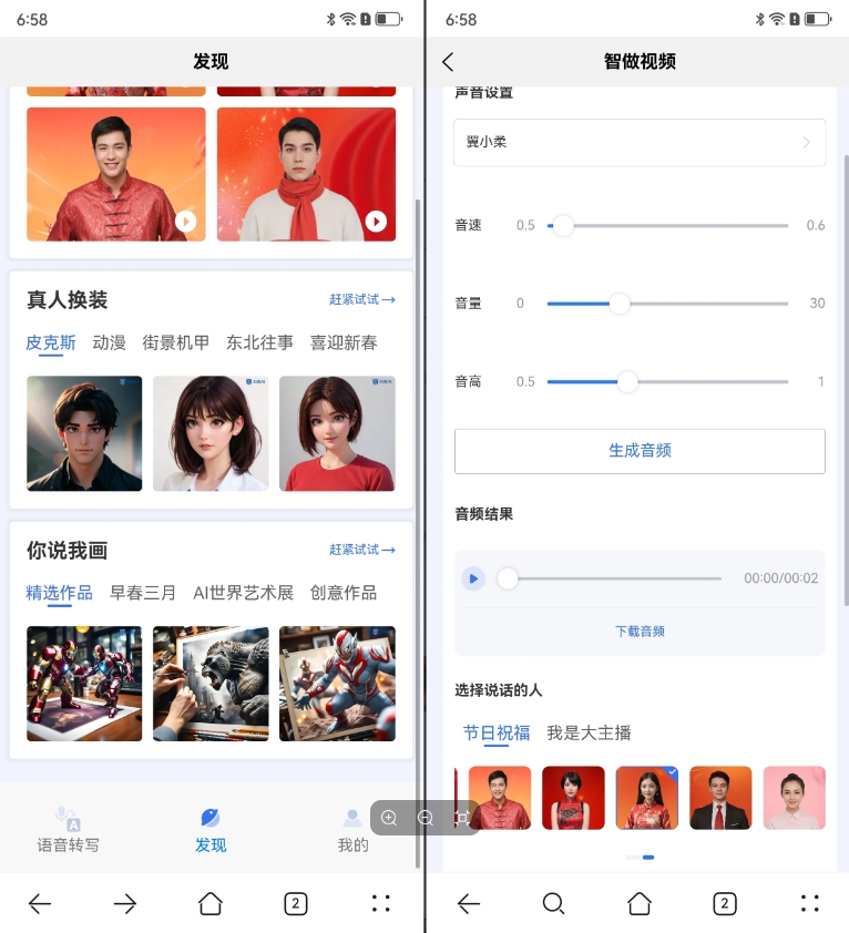 小雷簡單體驗了一下視頻生成功能,你可以根據自己的需求設置虛擬主播的播報內容,也可以選擇不同的語速、音色、形象等。雖說整體的效果還是有一些生硬,但對于很多老年人來說,如此簡單的操作已經能夠滿足他們的需求。