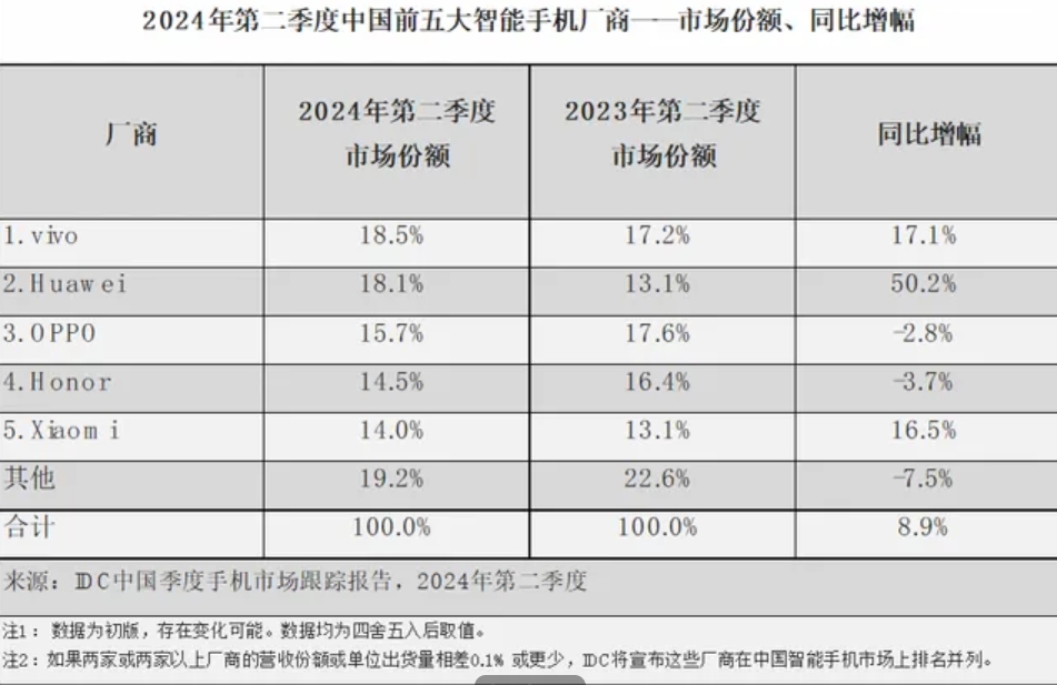 近日,國際數據公司(IDC)發布了最新手機季度跟蹤數據,報告顯示,2024年第二季度,中國智能手機市場出貨量達到7158萬臺,同比增長8.9%,延續增長勢頭。其中,在vivo、OPPO等廠商的推動下,Android市場同比增長11.1%。