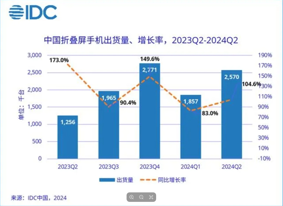 2024 年第二季度,中國折疊屏手機市場持續升溫,出貨量達到257萬臺,同比實現三位數增長。