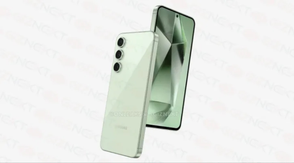 渲染圖顯示,Galaxy S24 FE 的機身背面采用家族式后置三攝排列,金屬直角邊框,底部有一個 USB-C 端口,電源和音量按鈕位于手機的右側。