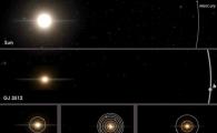 紅矮星 GJ 3512 和其新近識別出的氣態巨行星 GJ 5312b,它們與太陽系和其他鄰近的紅矮星系統的軌道比較。 天文學家發現在 31